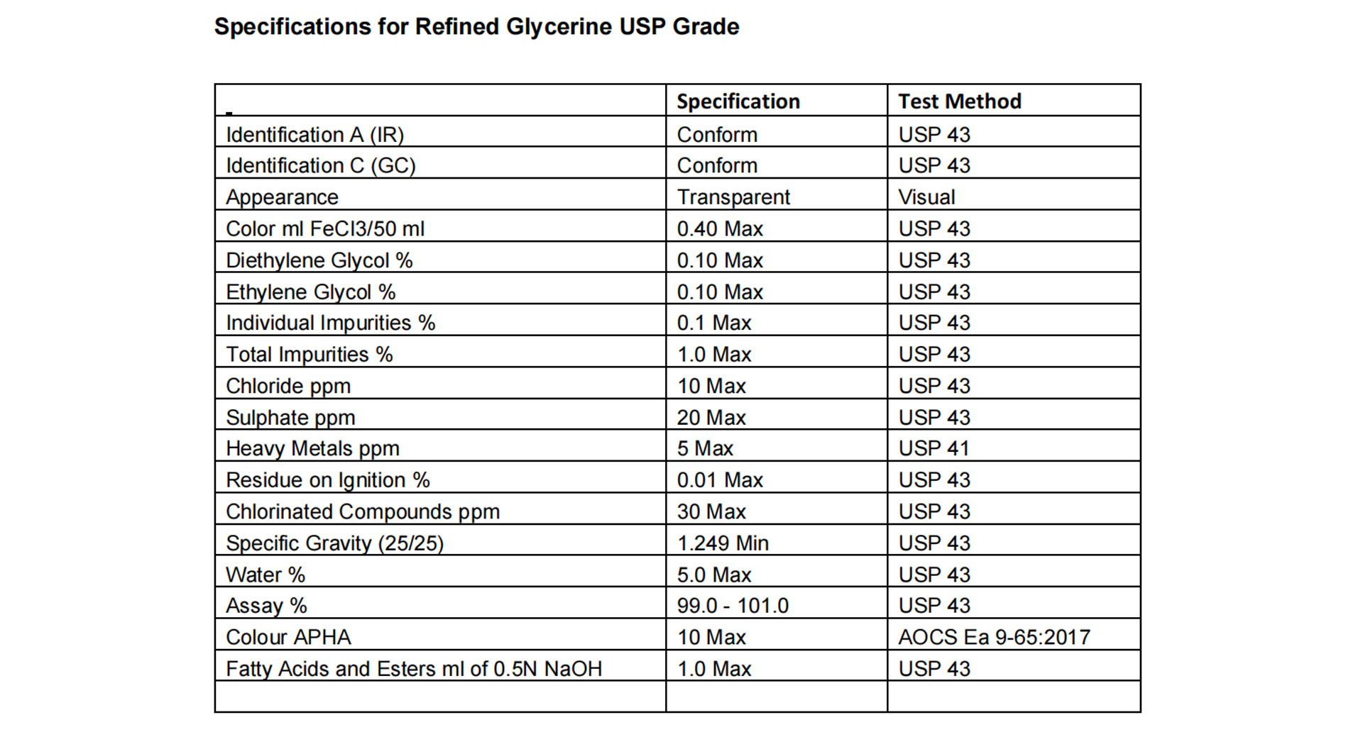 Prior to 1995, the industry standards for Refined Glycerine was 99.5% Min USP. In 1995 we set our benchmark for Refined Glycerine as USP 99.7%. This has now become the Industry Standard for Refined Glycerine.